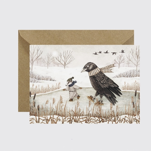 Kartka KRUK I BORSUK NA ŁYŻWACH jest autorską grafiką Julii Łyczkowskiej.